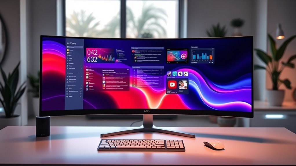 The best ultrawide monitors for multitasking efficiency are ones like the LG 34WK95U-W and Samsung Odyssey Neo G9. I love how they offer expansive screens that let me work on multiple apps side by side effortlessly. The wide aspect ratio reduces the need for multiple monitors, boosting my productivity. Plus, their high resolution and fast refresh rates make everything look sharp and smooth, helping me stay focused and efficient all day.