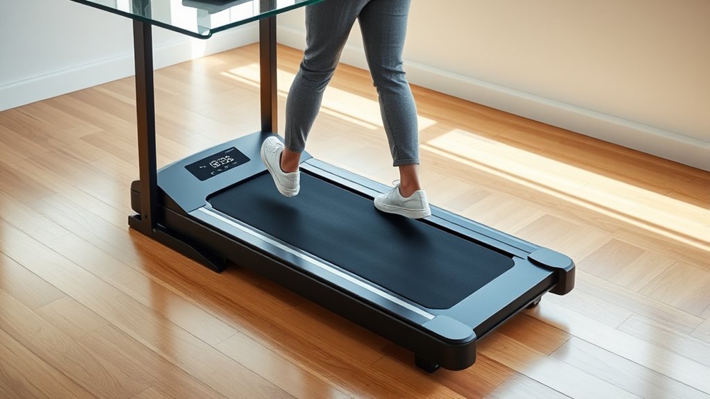 Ensuring safety and stability when using an under-desk treadmill is essential for a smooth workout experience and your well-being. A stable treadmill should have a low center of gravity and a broad, non-slip base to prevent tipping or wobbling during use. Shock absorption features, like multi-layer belts and cushioning systems, help reduce sudden slips and maintain balance. Slip-resistant rubber feet or pads on the underside guarantee the treadmill stays securely on various flooring surfaces. It’s also important to choose a model with a weight capacity that exceeds your body weight by at least 10%, providing added stability under load. For added safety, many treadmills include secure handrails or support handles, especially helpful if you have balance concerns or mobility issues.