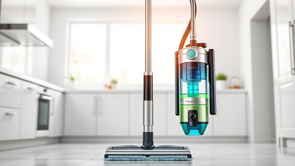 Evaluating a wet-dry vacuum mop combo’s cleaning features helps guarantee it meets your specific needs. I look for high suction power, ideally around 15,000 to 20,000 Pa, to ensure effective debris pickup on various surfaces. Multi-surface capabilities are essential, so I choose devices that handle hard floors, tiles, and area rugs seamlessly. Edge-to-edge cleaning features catch dirt in corners and along baseboards, making the job easier. Wet-dry functionality is a must for tackling both dry messes and wet spills in one pass, saving time. Finally, I check for self-cleaning or maintenance features, which help keep the device performing at its best and hygienically over time. These factors ensure thorough cleaning with less effort.