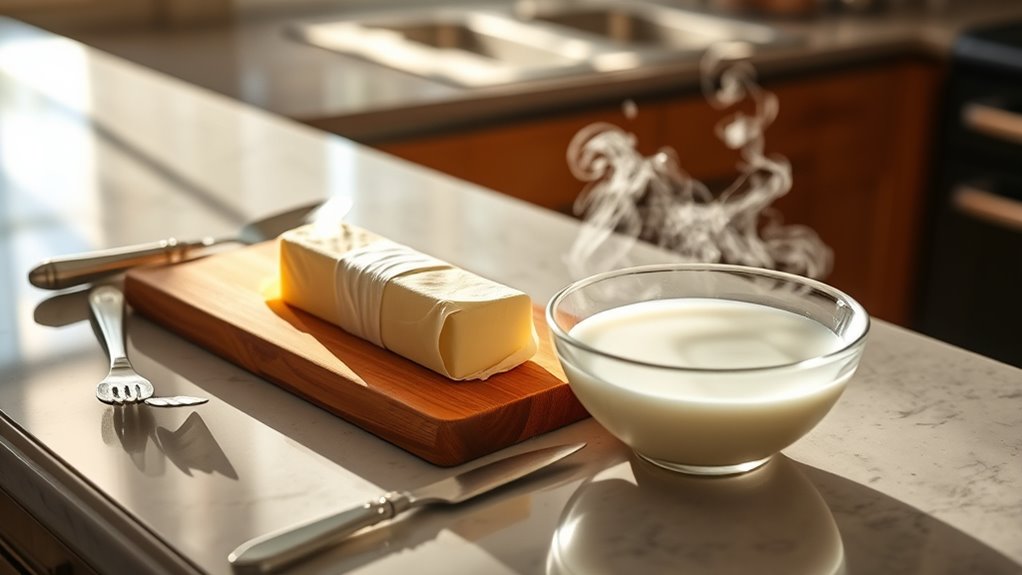 To safely bring butter to room temperature, leave it out on the counter for about 30-60 minutes. The ideal temperature is around 68°F to 70°F, which makes the butter pliable but not melted. If you’re short on time, cut the butter into 1 tablespoon pieces and microwave it on low power for 5-10 seconds, checking frequently. This way, you achieve the perfect consistency for baking. There’s more to mastering butter softening techniques, so keep exploring!