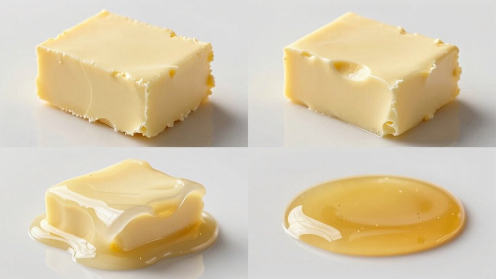 As butter warms closer to its melting point, you might observe a phenomenon called cream separation. When butter reaches higher temperatures, the fats begin to separate from the water and milk solids. This separation manifests as a greasy, oily layer on the surface and a more runny texture overall. If you’re baking or cooking and notice this separation, it’s often a sign that the butter is too warm and has started to break down, which can affect the final texture of your dish. The separation can also cause uneven melting if you’re melting butter for cooking, leading to a greasy, uneven result. Temperature control is essential in preventing such issues and maintaining butter’s optimal quality.