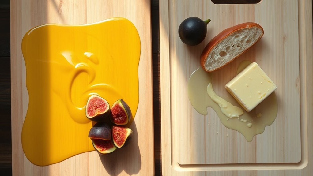 When it comes to cutting sticky foods, butter’s rich texture helps the knife glide smoothly and reduces sticking. It coats the blade nicely, making cuts cleaner. On the other hand, oil provides a lighter consistency that prevents sticky doughs from adhering to surfaces, especially in pasta or pizza. Both options have their advantages, depending on what you’re making and your flavor preferences. Stick around, and you’ll discover even more insights into the best choice for your needs.
