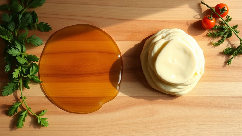 When deciding between butter and olive oil, it’s essential to contemplate their flavors and health benefits. Butter adds a rich creaminess to dishes but is high in saturated fats, which can raise cholesterol levels. In contrast, olive oil provides heart-healthy monounsaturated fats and antioxidants that may reduce inflammation. Both can enhance meals in different ways, so using them in moderation might be your best bet. Learn more about how each option fits into your cooking style and dietary goals.