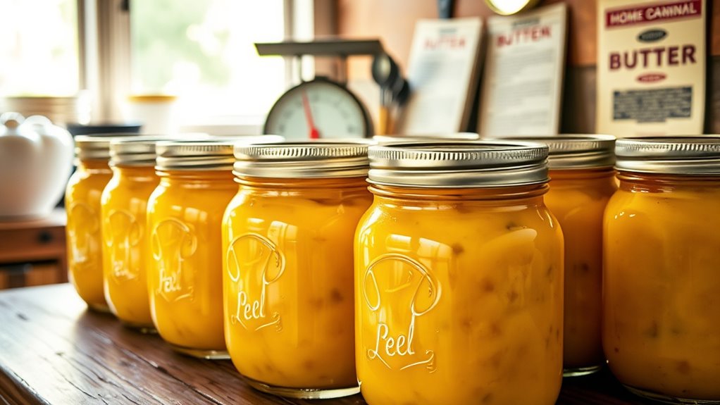 For canning butter, you’ll need a few essential pieces of equipment. Start with sterilized canning jars, lids, and bands. A pressure canner is vital for proper butter storage, as it guarantees safety. You’ll also want a large pot for melting the butter and a ladle for filling the jars. Finally, have a jar lifter handy for safely removing hot jars. Master these canning techniques, and you’ll be set to preserve your butter!