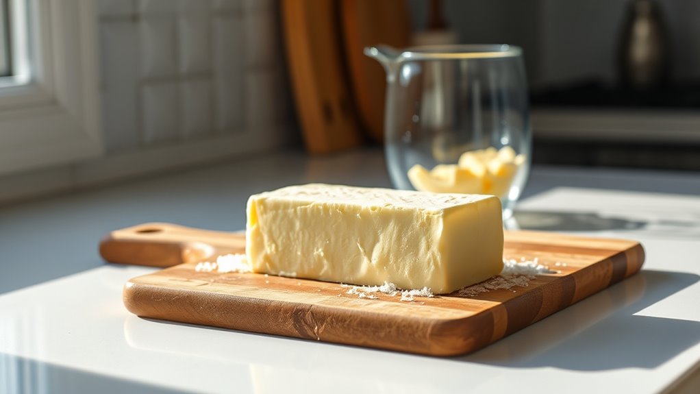 To thaw frozen butter, you’ve got a couple of great options. You can place it in the fridge overnight for slow, even thawing. If you need it quicker, you can cut it into smaller pieces and let it sit at room temperature for about 15-20 minutes. For immediate use, you can also grate it or microwave it on low power in short bursts. Remember these butter storage tips for best results!
