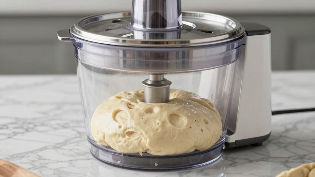Using your food processor to make perfect dough involves following a few straightforward steps to guarantee consistent results. Start by adding your dry ingredients, then pulse briefly before pouring in your liquid. This process helps control dough hydration, ensuring it’s neither too sticky nor too dry. As you process, watch for gluten development; over-processing can make the dough tough, while under-processing can result in weak structure. Use short pulses to avoid overworking the gluten.