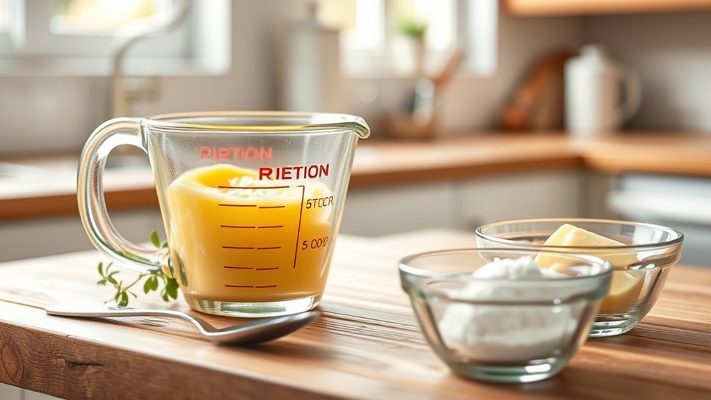 Measuring butter without a scale is easy! If you’re using stick butter, just cut along the marked lines for precise tablespoons or cups. When using spreadable butter, scoop it into a measuring cup, pressing down to remove air, and level it off. For larger amounts, try the water displacement method by adding butter to a measured amount of water until you reach your desired measurement. There’s more to learn about measuring alternatives and storage tips too!