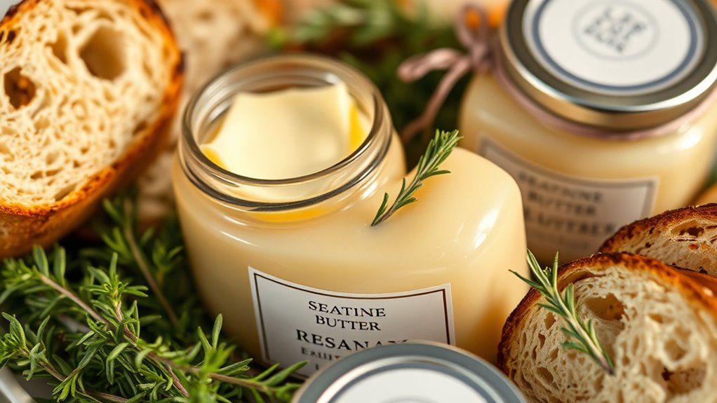 When storing these butters, keep them in airtight containers to preserve freshness. Packaging innovations like vacuum-sealed jars help maintain flavor and extend shelf life, ensuring your holiday favorites stay delicious. With the right storage and pairing, these seasonal butters elevate your festive dishes effortlessly.