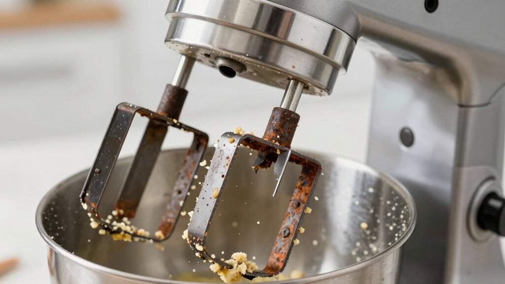 Did you know that 60% of mixer failures are caused by attachment failure? You’ll notice signs like the motor overheating or unusual noises, which indicate imminent damage from whisk attachment use. If the attachment feels loose or makes grinding sounds, stop immediately. These signs warn of potential motor overheating or attachment failure, risking damage to your mixer. Pay attention to these indicators to prevent costly repairs.