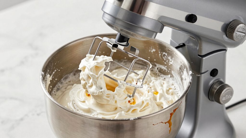 To keep your stand mixer running smoothly and extend its lifespan, regular maintenance is essential. Start by cleaning your mixer after each use, paying attention to the beaters and bowl to prevent buildup that can strain the motor. Check the mixer’s attachments and ensure they’re properly secured, which supports ingredient accuracy and prevents unnecessary overloads. Lubricate moving parts as recommended by the manufacturer to reduce wear and tear. Also, avoid overloading the bowl with ingredients; follow recipe quantities to prevent motor stress. Periodically inspect the power cord for damage. Proper mixer maintenance not only prolongs its life but also ensures consistent performance. By taking these simple steps, you’ll keep your mixer reliable and ready for your next culinary adventure.