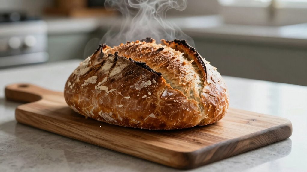 To prevent over-steaming, monitor the steam timing carefully and stop it at the right moment. Keep an eye out for over steaming signs like a soggy crust or excessive moisture. Use a timer to control steam release precisely, and start with shorter steam durations, adjusting as needed. This way, you’ll maintain ideal moisture without overdoing it, resulting in perfectly baked bread with a crisp crust and tender crumb.