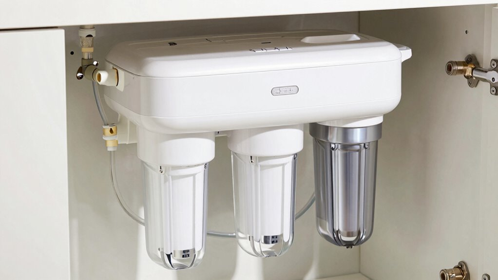 You’ll notice signs of a leaking under-sink filter system if you see water pooling under the cabinet, damp spots on the cabinet floor, or mold growth. Constant drips or a sudden drop in water pressure can also suggest leaks. Regular filter maintenance helps prevent leaks, and checking connections ensures leak prevention. Address leaks promptly to avoid water damage, and always tighten fittings and replace worn-out parts to keep your system secure.