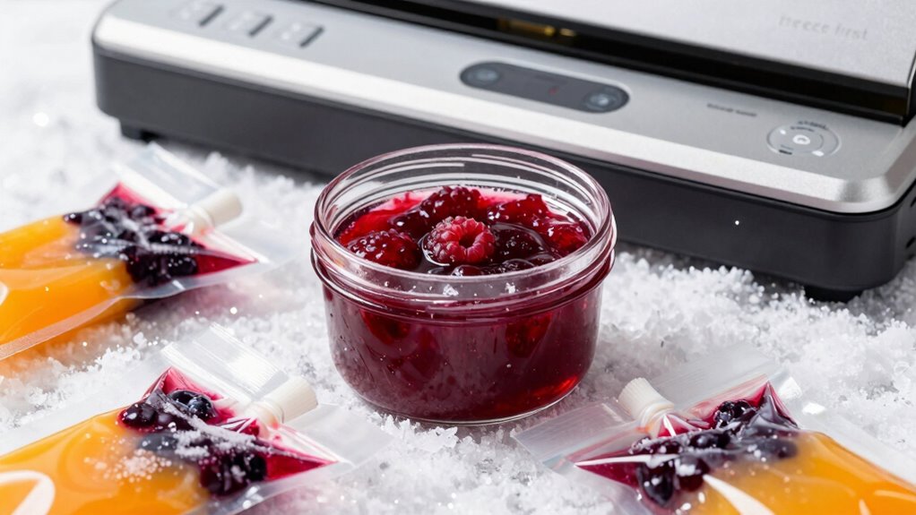 Frozen liquids can pose unique challenges during vacuum sealing, often leading to seal failures and leaks if not handled properly. To prevent seal failures, guarantee the liquid is fully frozen before sealing. Partially frozen or slushy liquids increase the risk of leaks and compromised seals. Always wipe the sealing edge thoroughly to remove any moisture or condensation that can interfere with the seal. Use the correct vacuum sealer setting designed for liquids, and consider using a chamber sealer if available, as it provides better leak prevention. Avoid overfilling the bag, which can cause pressure issues and leaks. Checking the integrity of the seal after sealing helps catch failures early. Proper handling and attention to these details improve leak prevention and ensure your frozen liquids stay sealed securely.