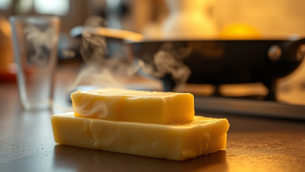 Butter turns rancid when it’s exposed to light, heat, and air. These factors trigger oxidation, breaking down the fats and forming free radicals. This process not only alters the flavor but also creates unpleasant odors that signal fat degradation. Leaving butter out on the countertop or using clear containers accelerates rancidity. To maintain freshness, consider proper storage methods. If you want to learn practical tips for preserving butter’s quality, there’s more to explore.