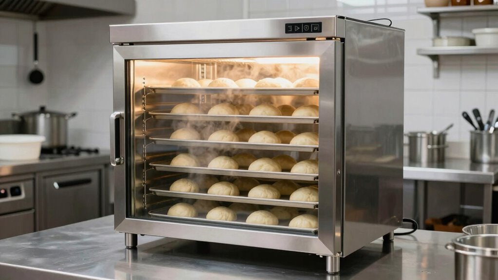 In the world of artisan bread, proofing is a vital step. It’s where the dough develops flavor and structure, leading to a better crust and crumb. A consistent, controlled environment helps the dough ferment evenly, which is key for achieving that perfect rise. Commercial kitchens have long relied on proofing cabinets because they streamline the process and guarantee reliable results. These cabinets maintain precise temperatures and humidity levels, creating the ideal conditions for even proofing, whether you’re working with sourdough, baguettes, or ciabatta. Proper environmental control is crucial for consistent baking outcomes. Additionally, understanding how to monitor and adjust these conditions can make a significant difference in your baking success.
